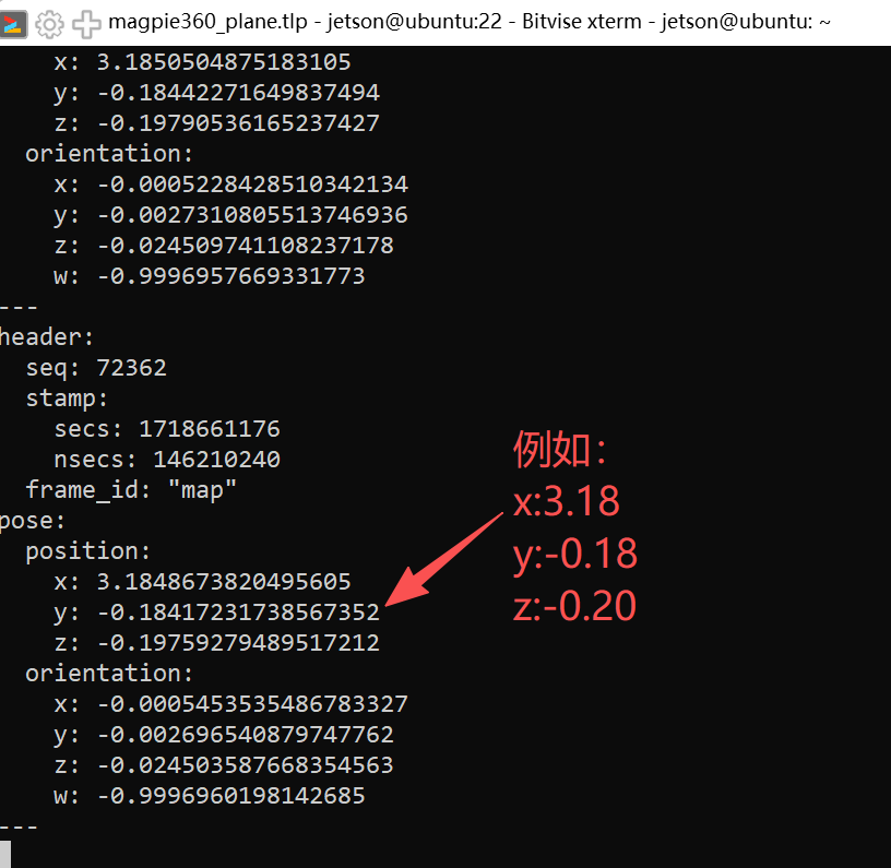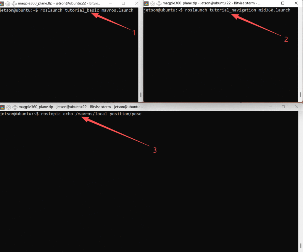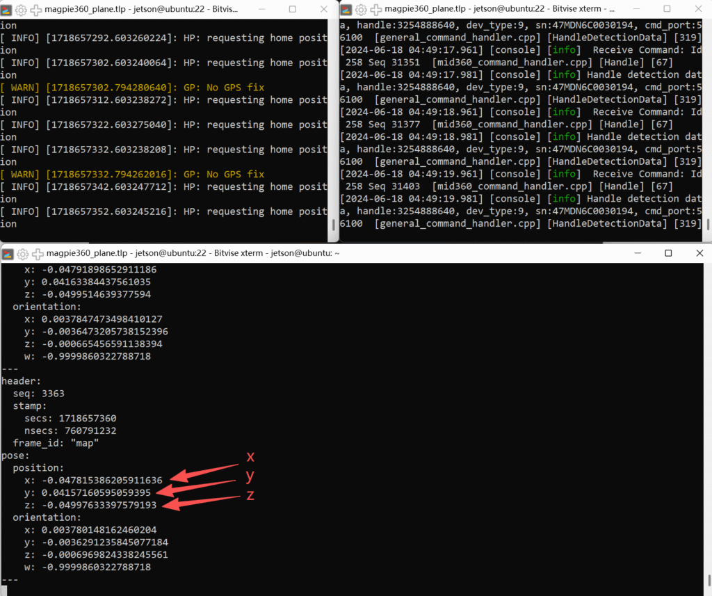 4.观察ssh终端三中输出的飞行器位置与姿态信息(确保数据一直在刷新,否则需要重新开始3步骤)。