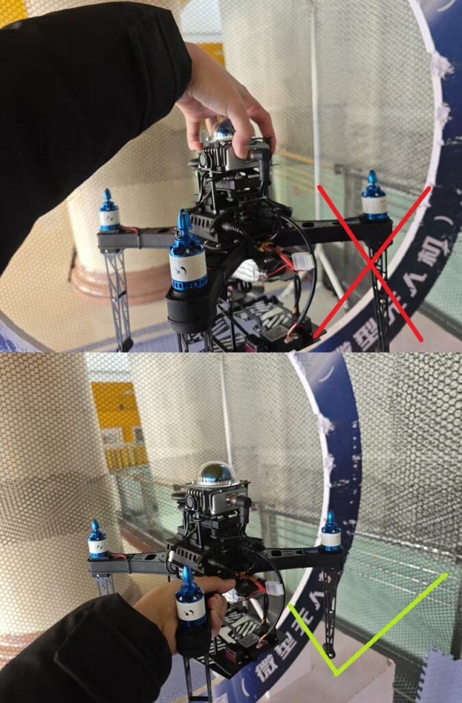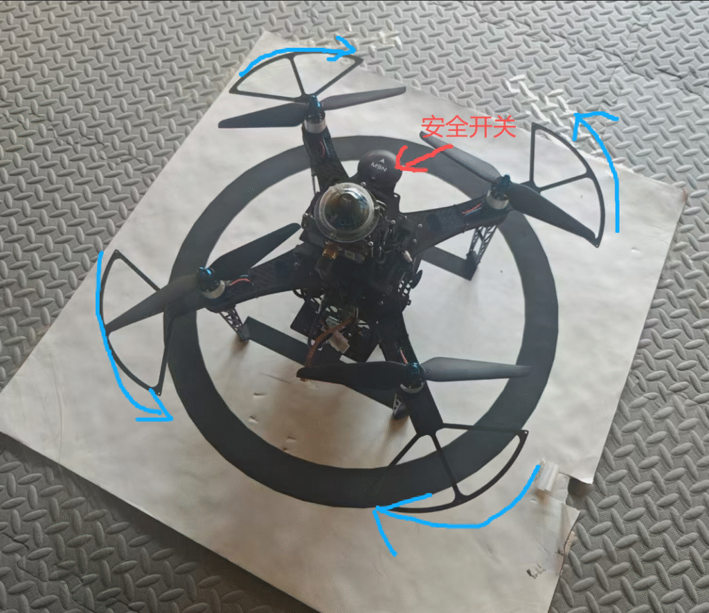 2.将飞行器放置在场地起飞点,并且确保已经拆卸桨叶,确保飞行器方向和位置完全准确后开始下一步。