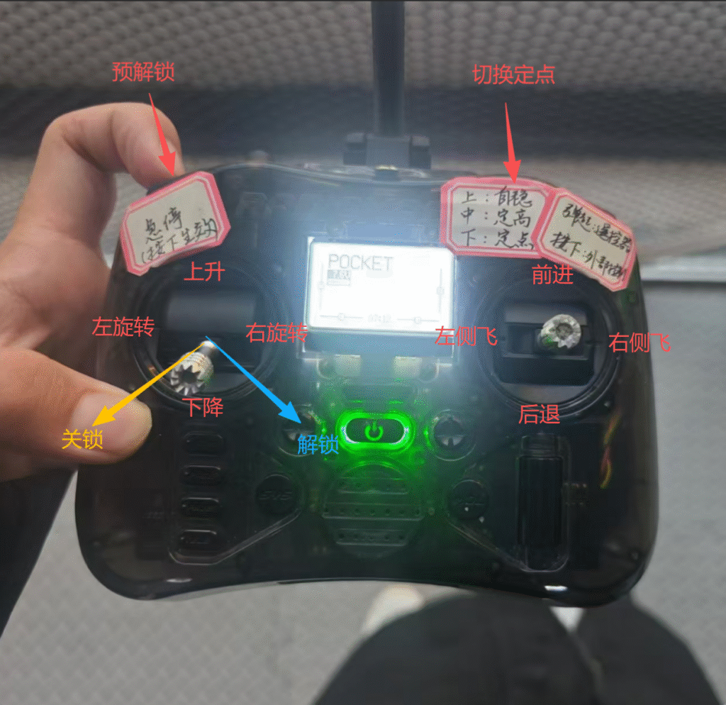 5.按下无人机模式切换按钮把无人机切换为定点飞行模式,按下开关预解锁无人机,向右下打油门杆解锁无人机,随后开始飞行。