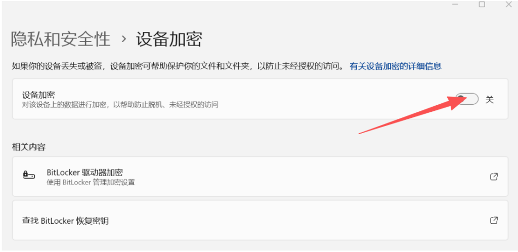 打开 Windows 设置→ 按 Win + I → 进入 “设置” → 选择 “隐私和安全性” → “设备加密”(或直接搜索 “BitLocker”)→ 如果看到 “设备加密”已开启,点击 “关闭”。