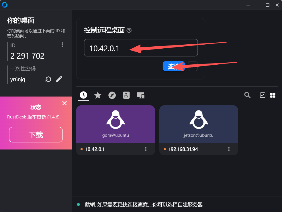 2.打开rustdesk的桌面版,输入IP后点击连接
