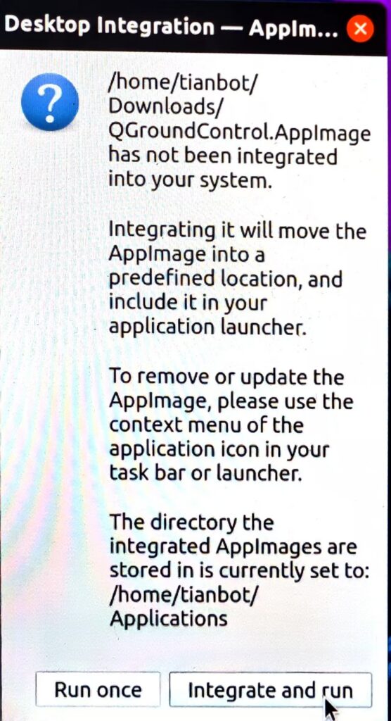 4.执行install.sh(注意:前面不要加sudo)。脚本执行到最后会自动打开一个窗口,选右下角的integrate ans run,之后qgc会打开,完成软件初试设置,可以手动关掉。